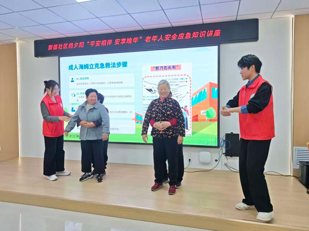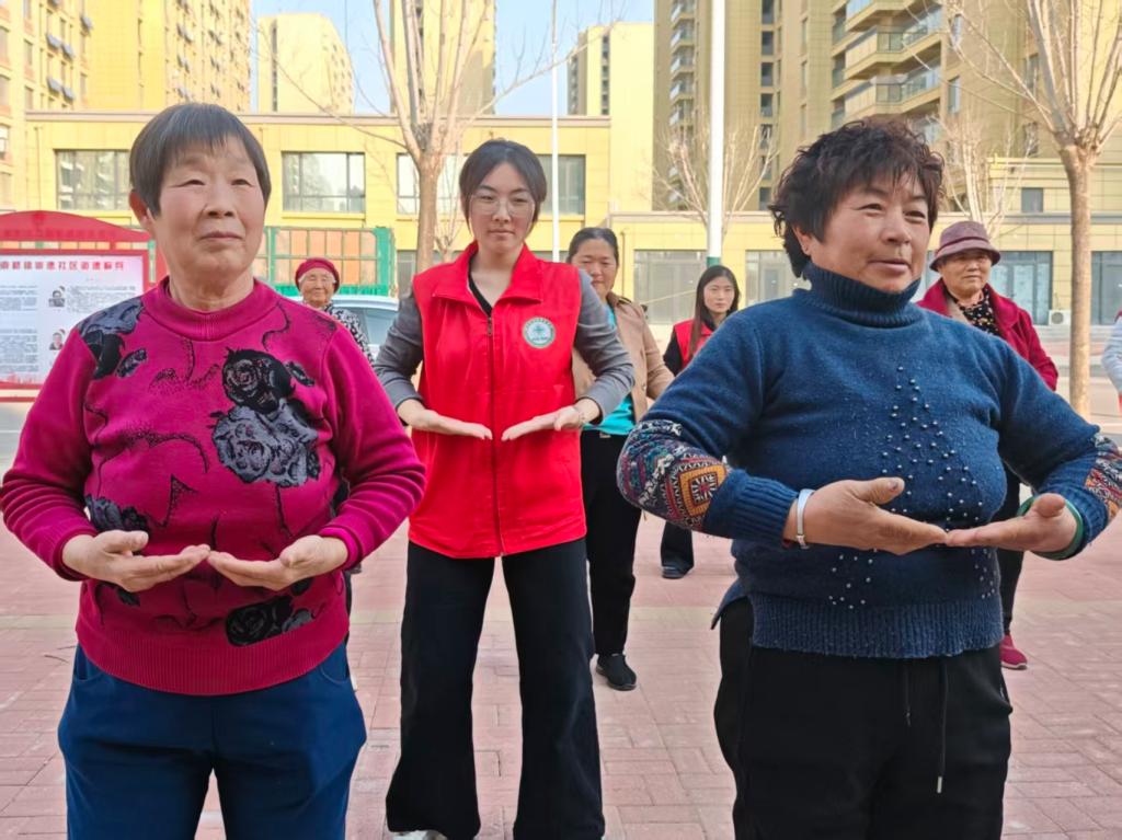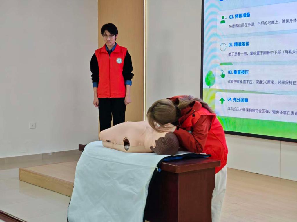 活动伊始,志愿者们围绕“雷锋精神”与“植树节”为主题,通过详尽的讲解,阐释了雷锋精神的时代内涵与植树节的生态意义,引导社区居民树立绿色环保意识与无私奉献精神,让奉献精神与绿色理念深入人心。随后,志愿者现场示范讲解心肺复苏、海姆立克急救法等应急技能,细致指导居民掌握突发状况应对技巧,有效提升了居民的安全防护与自救互救能力。同时,活动还设置了八段锦教学、健康义诊以及与老年人共种多肉等互动环节,将传统养生、健康服务与趣味绿植体验相结合,为老年居民送去温暖与关怀,进一步拉近了校社之间的距离。