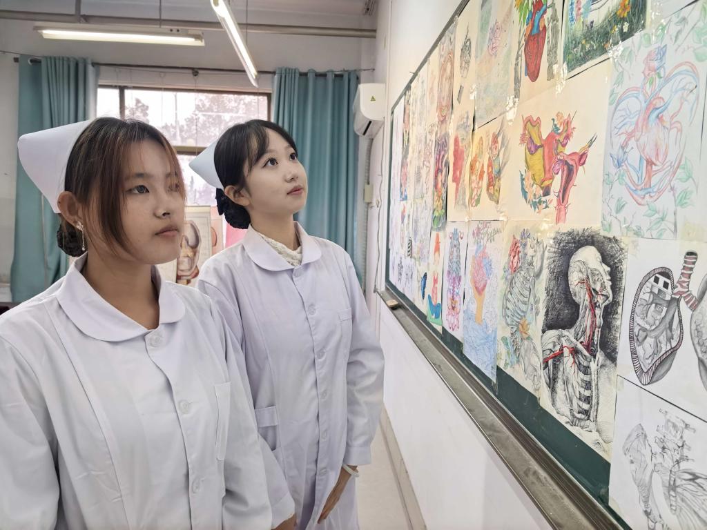 全体师生手持素菊,神情庄重,以最诚挚的敬意参与到这场特殊的活动中,向“无言良师”表达深切的缅怀与感恩。活动开始,主持人向大家介绍了“大体老师”的崇高意义——他们是医学教育中静默的导师,以身体为教材,助力医学生探索人体奥秘,掌握解剖知识,并呼吁同学们永怀感恩之心。随后,健康医学院副院长在致辞中表示,“大体老师”的捐献,是对医学事业最真挚的支持,也是生命价值最为崇高的延续。他勉励同学们始终保持对生命的敬畏,将这份奉献精神转化为钻研医学、服务患者的源源动力。仪式最后,师生们依次走向“大体老师”纪念台前献花。全体人员肃立默哀。这一分钟的静默,并非空白,而是对生命重量的一次深刻体悟。默哀仪式结束后,师生有序参观了人体骨骼标本展区,进一步学习人体结构知识。展区旁陈列着同学们亲手绘制的解剖学图谱,细腻的线条与精准的标注,不仅表达了对“大体老师”的崇高致敬,也为新生树立了严谨治学的榜样。
