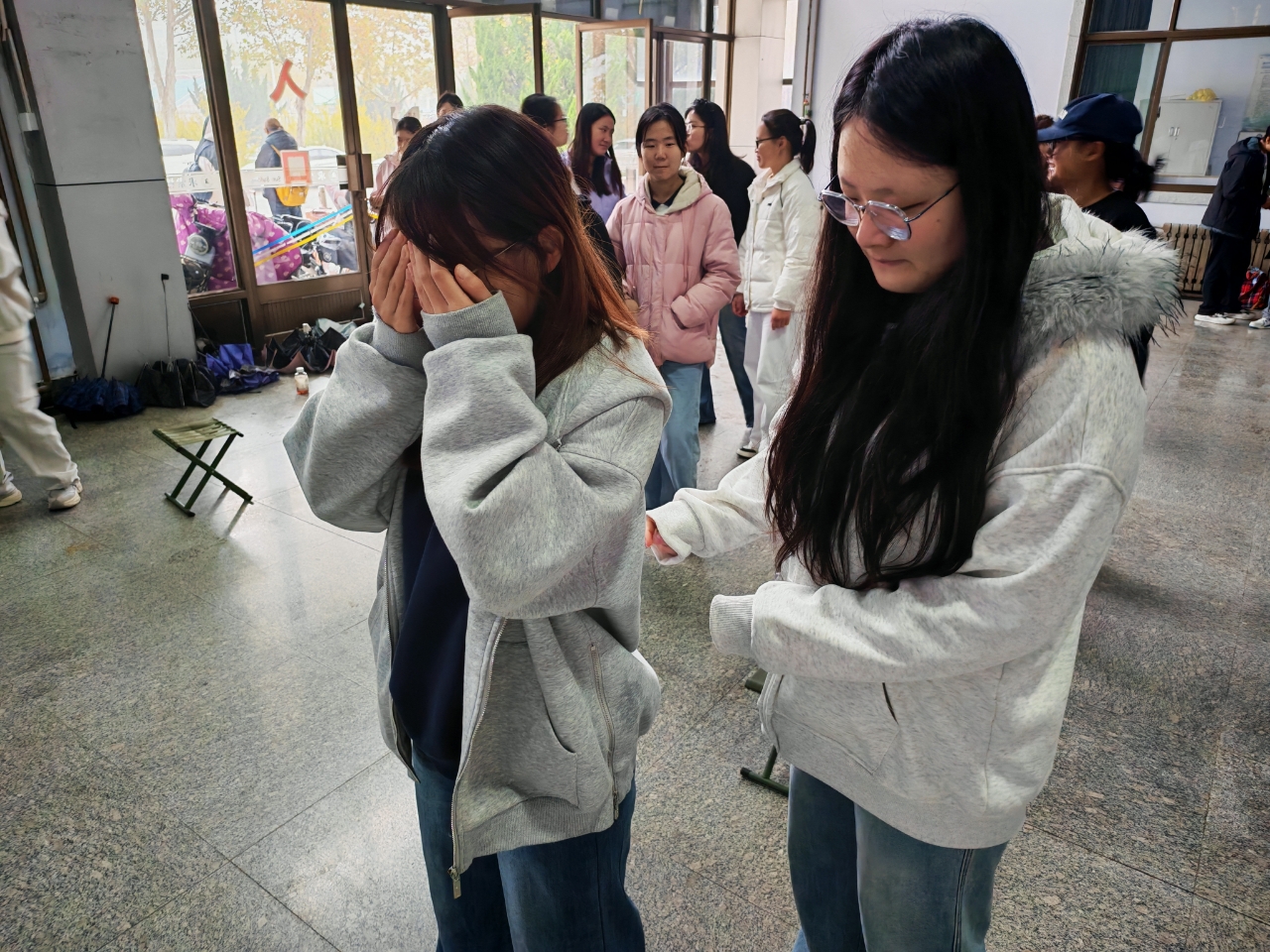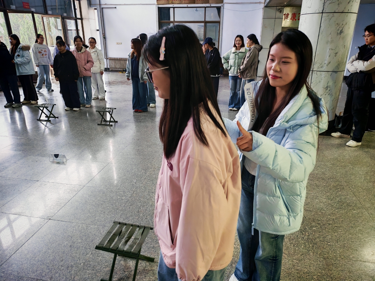 活动以立冬文化科普为开篇,主讲人紧扣节气“冬藏”内核,生动解读传统生活智慧中“顺应时节、涵养心性”的深刻内涵,引导同学们感知季节更迭与情绪变化的内在关联,学会在冬日里与自我情绪平和相处。随后,“盲人引路”互动游戏点燃现场氛围,同学们随机组队、分工协作——“盲人”蒙眼信赖前行,“引路者”耐心指引方向,在穿越预设障碍的过程中彼此托付、双向奔赴。角色互换间,大家深刻体会到信任与关怀的力量,更在默契配合中搭建起心灵相通的温暖桥梁。活动尾声,主讲人围绕“向内探索、安顿心灵”的核心主旨,鼓励同学们借冬藏之机沉淀自我、关照内心需求,在蓄力沉淀中积蓄成长动能。