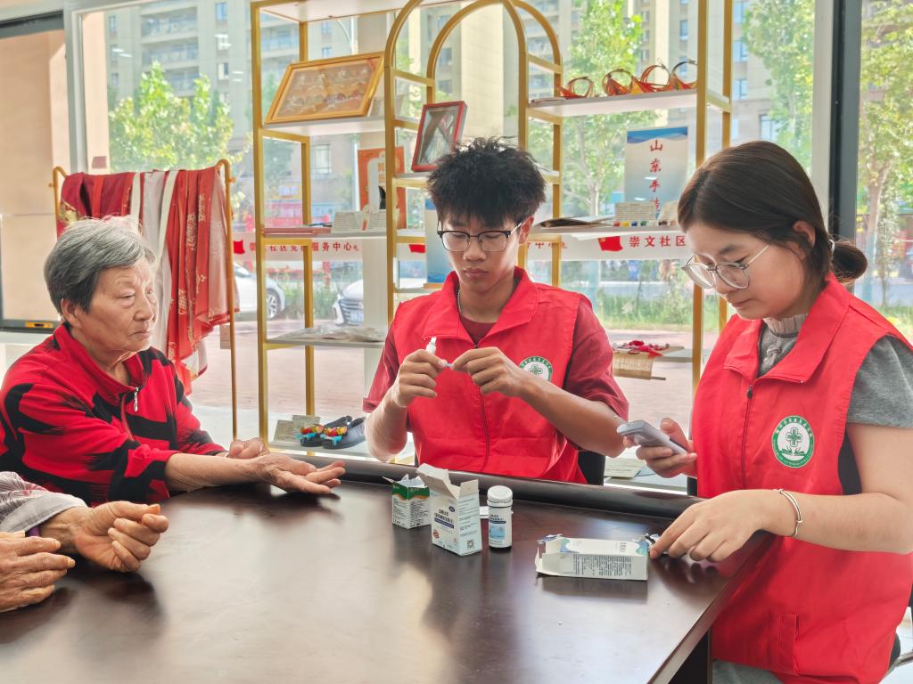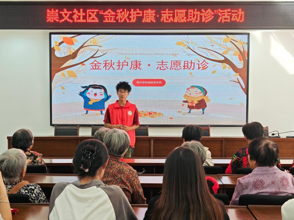 活动中,健康医学院的志愿者们走进崇文社区,设立健康知识讲座和免费义诊两大服务专区,为50余名社区居民提供了便捷的医疗服务。在健康知识讲座区,志愿者重点讲解秋冬季传染病的传播途径、典型症状及家庭防护要点,并现场演示“七步洗手法”与居家消毒技巧,通过“理论讲解+实操演练”相结合的方式,有效提升居民的自我防护意识与能力。在义诊区,志愿者为居民免费测量血压、血糖,根据检测结果提供个性化的健康建议,帮助大家识别潜在健康风险,倡导养成科学、文明、健康的生活方式。此次活动将专业医疗服务送到居民“家门口”,切实增强了社区的健康防护水平,赢得了居民的一致好评。