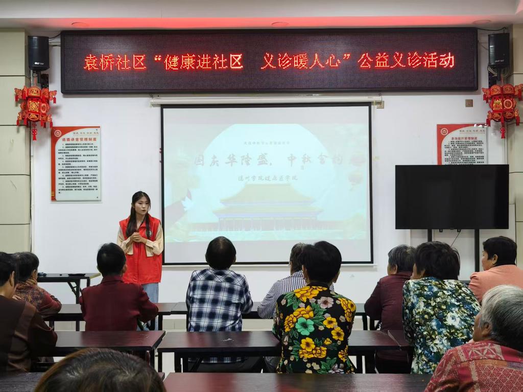 为传承中华传统节日文化,弘扬敬老爱老美德,在国庆与中秋双节来临之际,9月28日健康医学院志愿者赴袁桥社区,开展“国庆华隆盛,中秋含韵光”志愿服务活动,为社区老年人送上节日关怀与健康服务。
