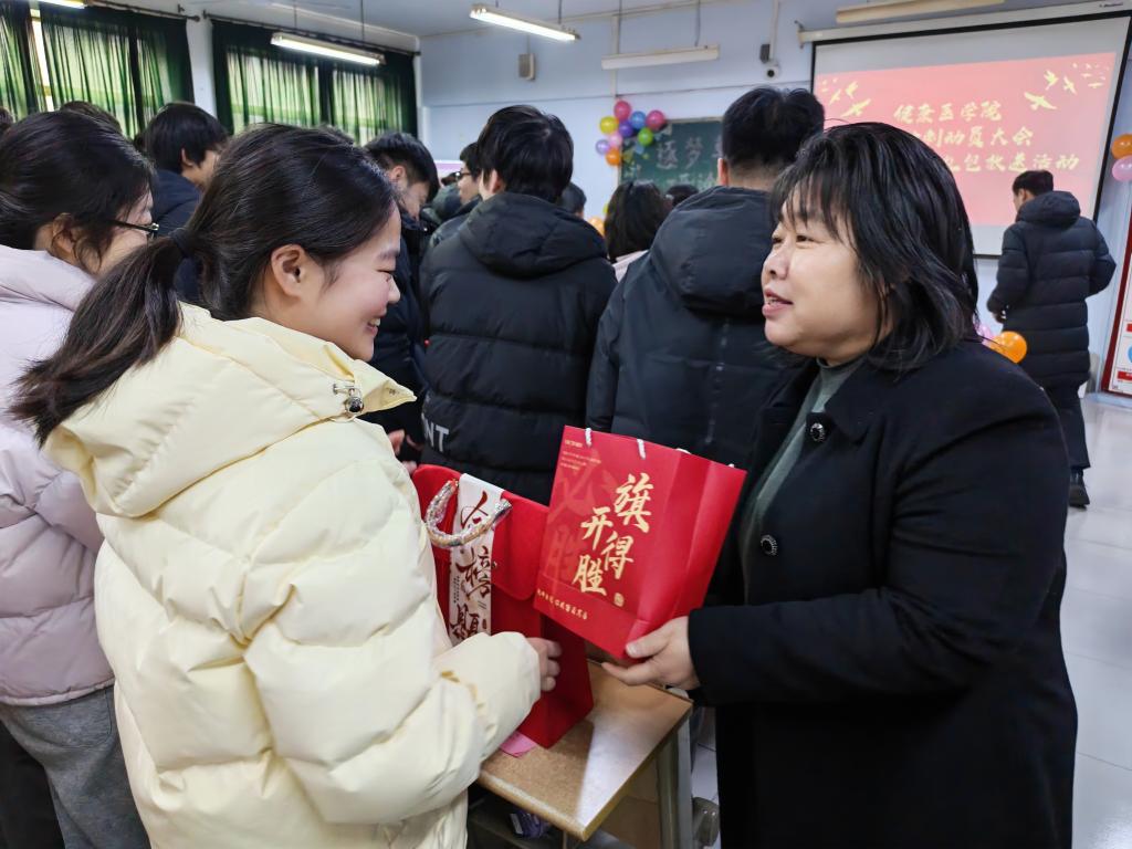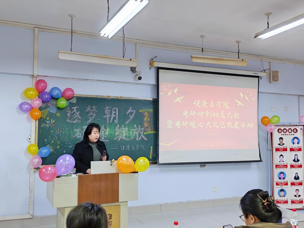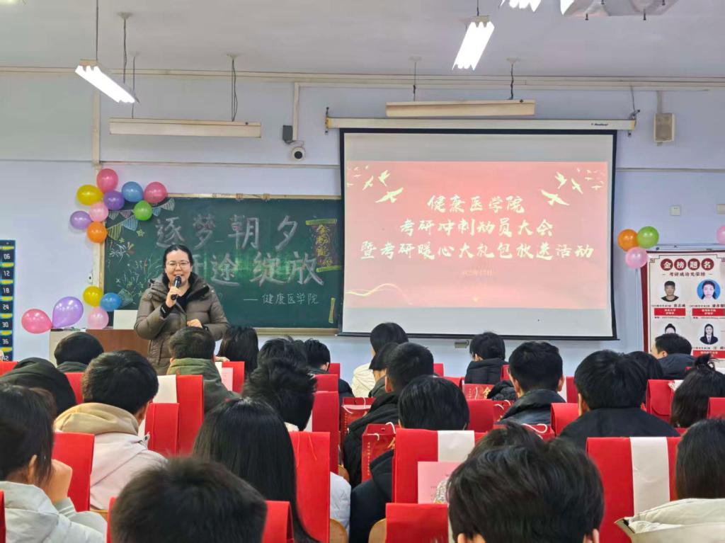 为缓解考研学子备考压力,传递学院的深切关怀,为最后冲刺注入温暖力量,12月16日,健康医学院在求实楼205教室举办2026届考研冲刺动员大会,并为70余名考研学子送上满载祝福的定制暖心礼包,为他们的研途征程加油助力。