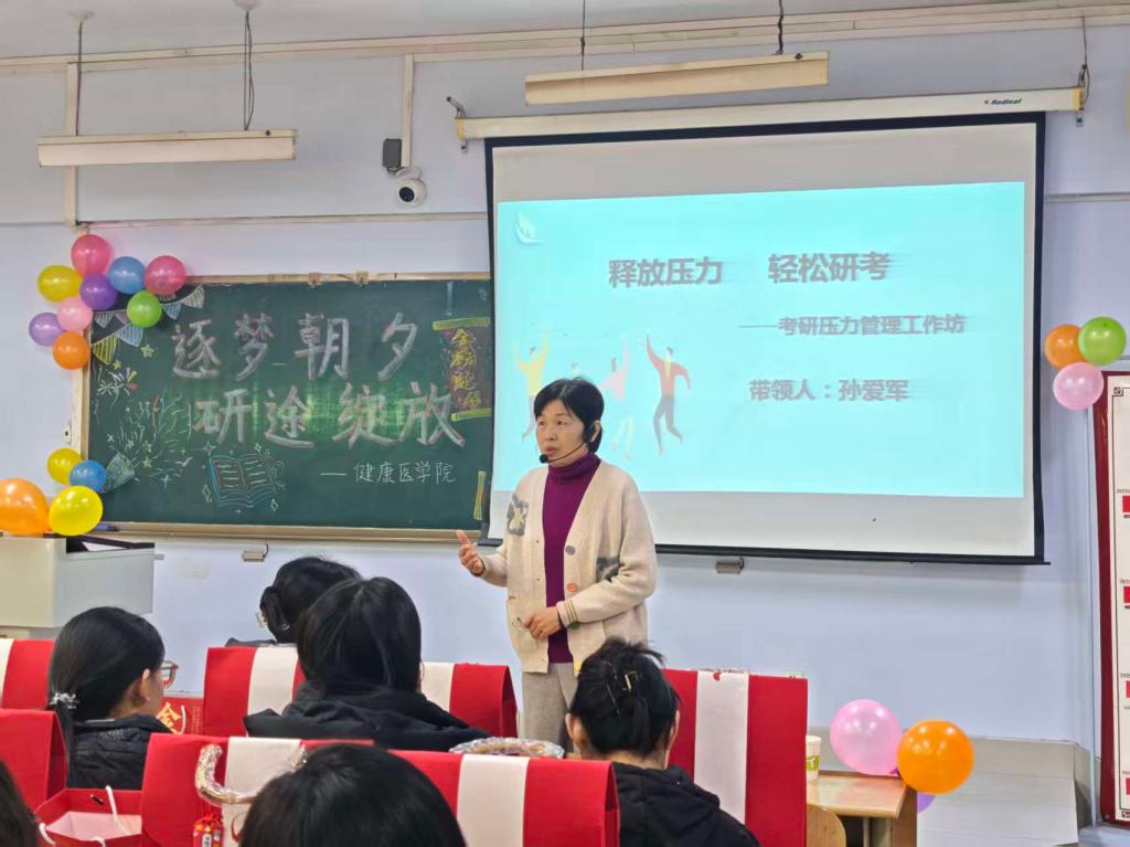 随后,马克思主义学院副教授、国家二级心理咨询师孙爱军根据多年辅导经验,为同学们带来一场实用的心理调适分享。她细致讲解了压力疏导的方法,传授了积极心理暗示的技巧,并鼓励大家:“坚持追梦的人,本身就是自己的英雄!”真诚的话语点燃了在场学子的斗志。