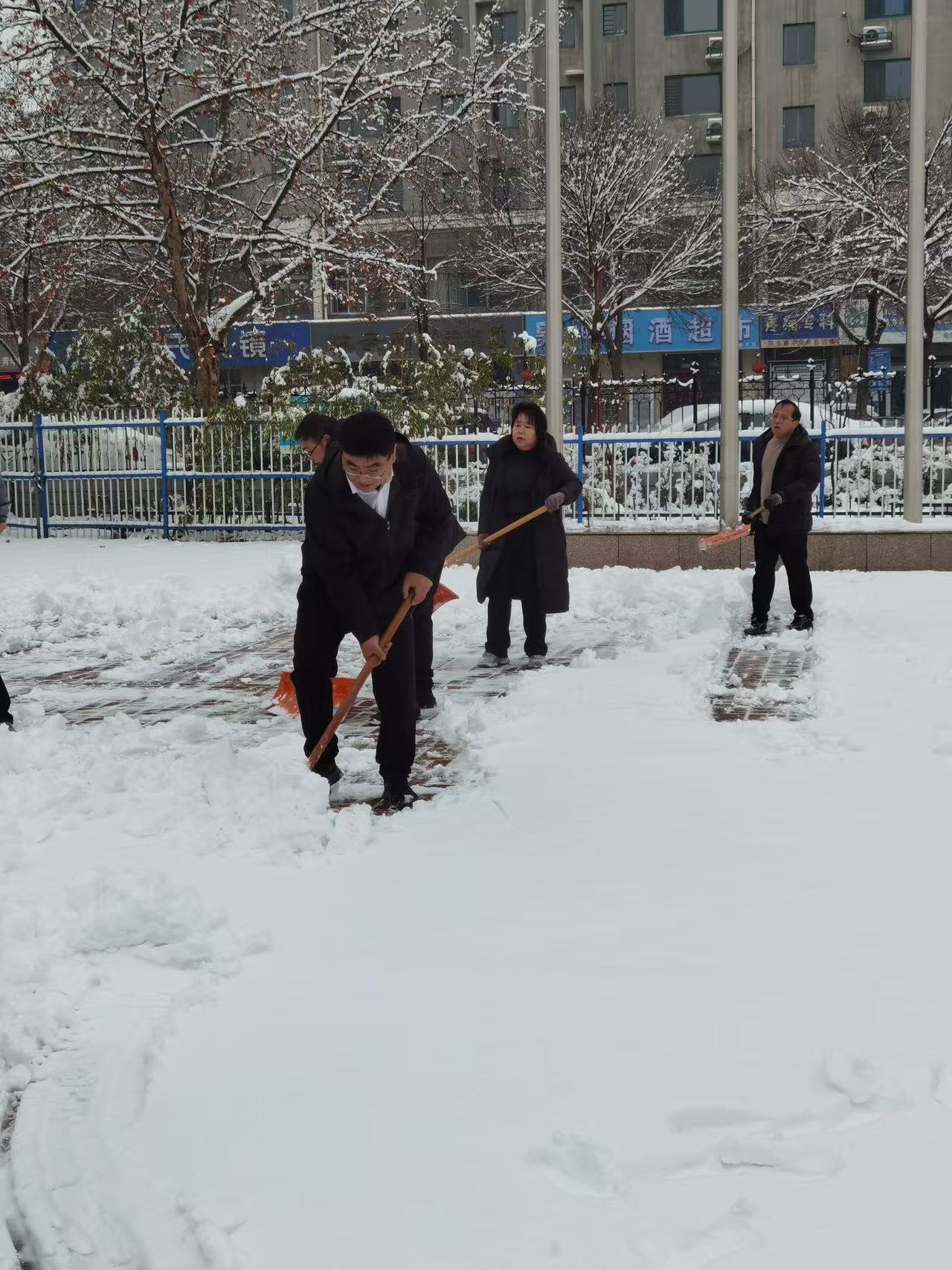 降雪过后,校园内主干道、教学楼出入口、宿舍区周边及台阶处覆盖了一层积雪,部分区域因气温较低形成薄冰,给即将返校的学生出行带来极大安全隐患。学院领导率先垂范、以身作则,带头挥锹铲雪、清扫路面,用实际行动引领大家投入战斗;老师们分工协作、默契配合,有的弯腰挥动扫帚清扫浮雪,有的手持铁锹铲除顽固冰棱,有的合力将堆积的积雪搬运至指定区域。尽管初春寒风凛冽,指尖被冻得通红,但老师们热情高涨、干劲十足,没有丝毫懈怠。大家不畏严寒、迎难而上,铲雪声、扫帚摩擦声、互助叮嘱声交织在一起,汇成了校园里最温暖动人的乐章。