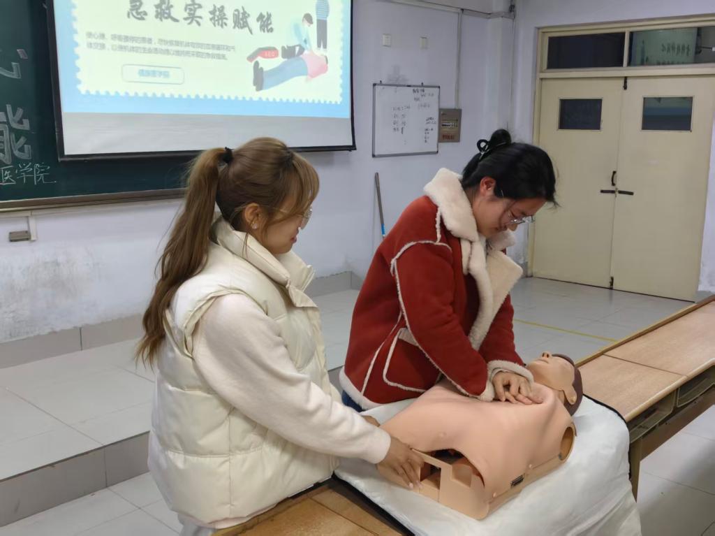 活动伊始,主讲人依托扎实的专业功底,围绕心肺复苏(CPR)的核心要义与标准化操作流程展开系统讲授。重点阐释了心脏骤停救援中“黄金四分钟”的关键意义,并借助模拟教具,精准拆解了胸外按压的频率、深度以及人工呼吸的操作要领。通过真实案例复盘,深入剖析了日常生活中常见的急救误区,让大家深刻领悟到急救技能作为“生命防线”的硬核价值。随后,在沉浸式实操环节。志愿者们采取“一对一”精准辅导模式,手把手纠正同学们的按压手势、着力点与节奏把控。面对实操中的困惑,志愿者们耐心答疑、反复示范,确保每位同学都能掌握动作要领,切实提升应对突发紧急状况的能力。